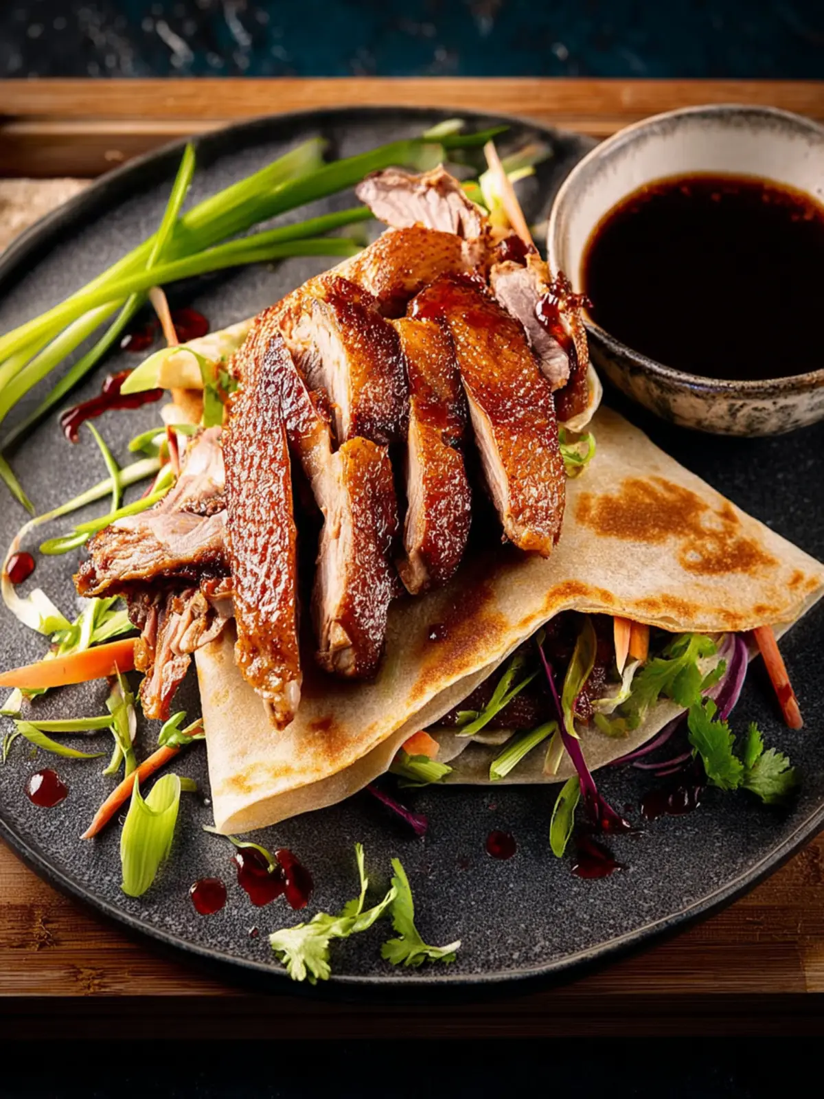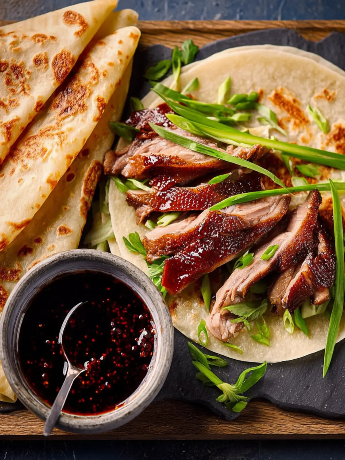 Pancakes: Make sure to use thin pancakes. Whether you choose to buy them or make them from scratch, the right texture is crucial—they should be soft yet sturdy enough to hold the duck and the garnishes.
