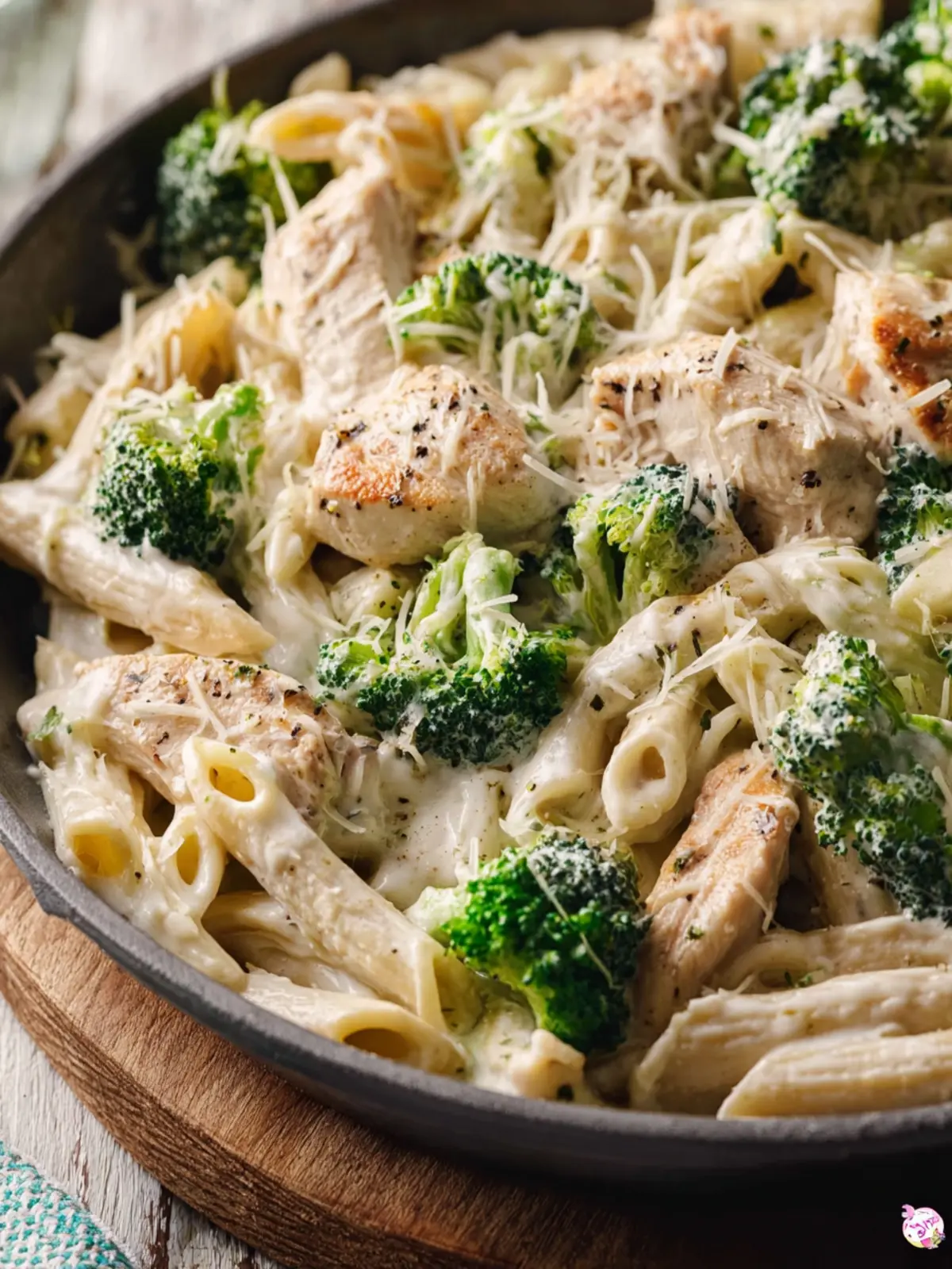 A delicious and creamy chicken pasta dish loaded with broccoli and Parmesan cheese.