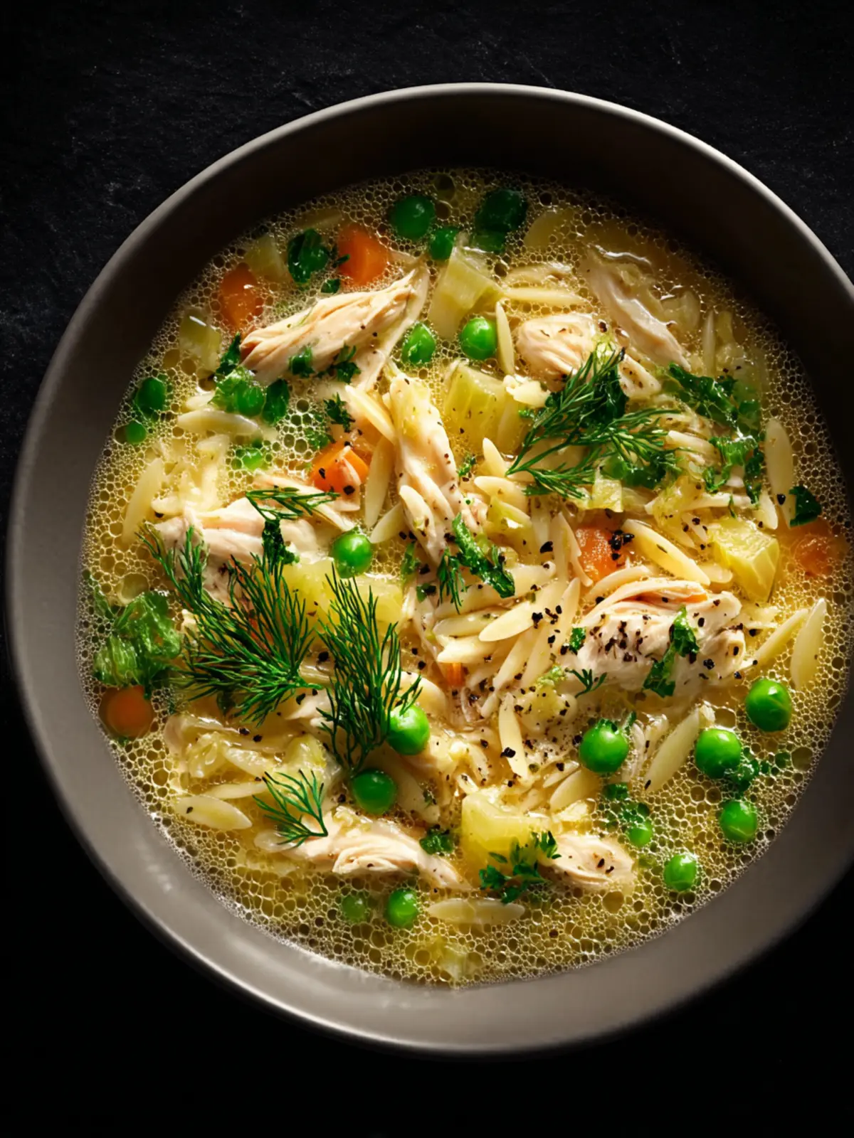 A comforting chicken orzo soup filled with fresh vegetables and herbs.