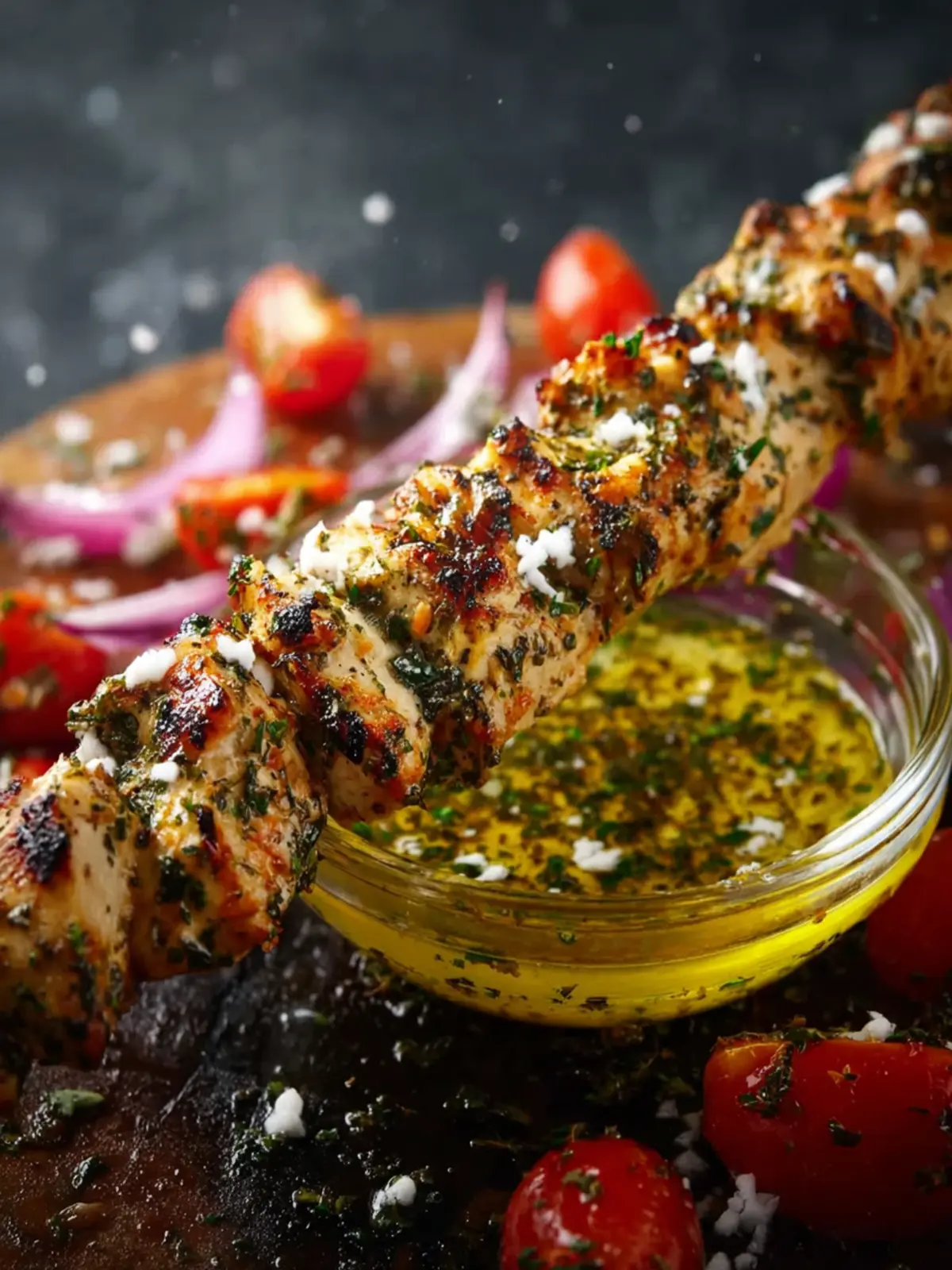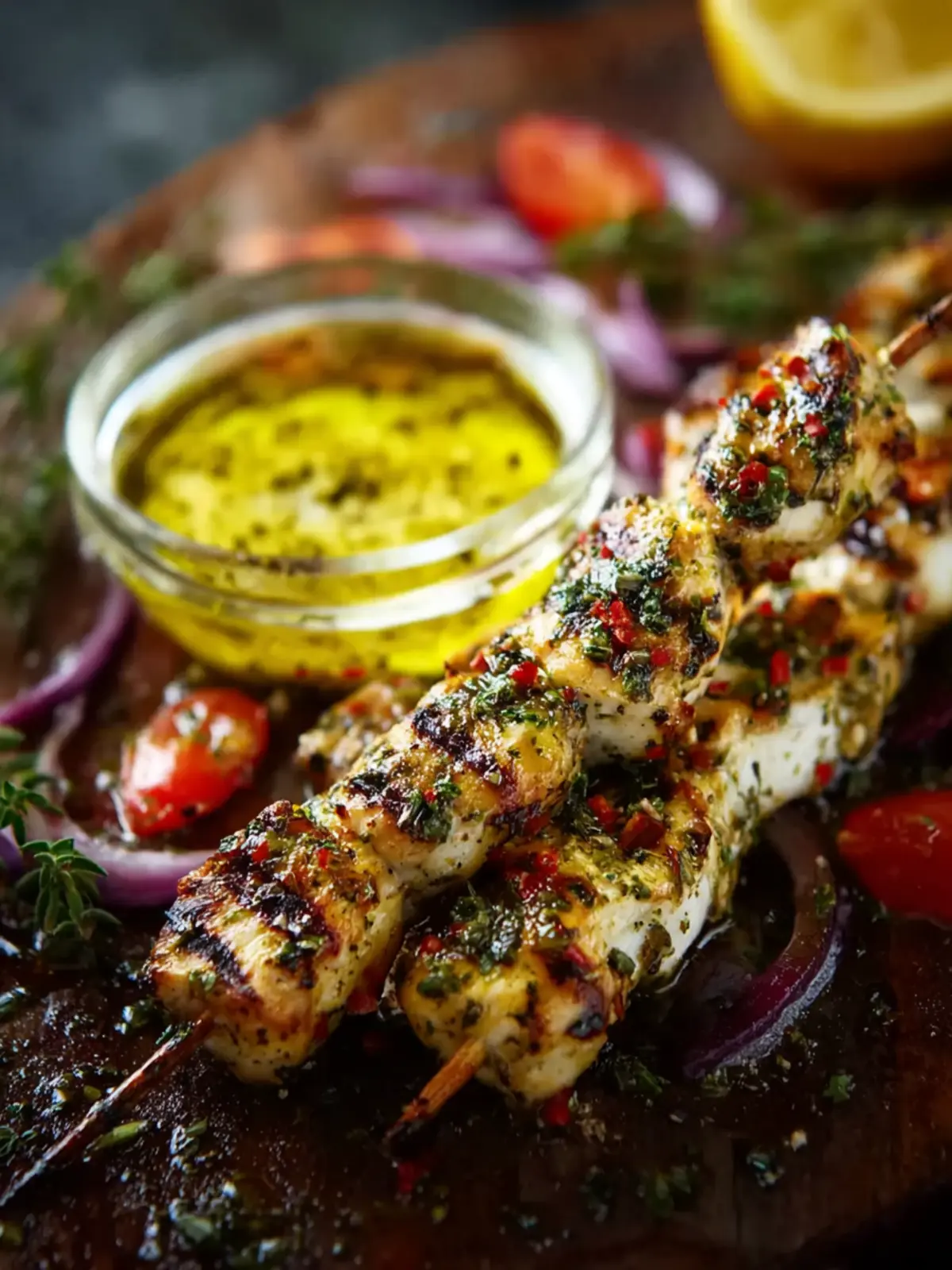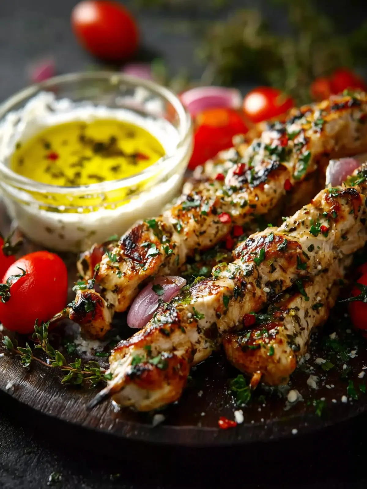 Delicious grilled chicken skewers marinated in olive oil, lemon juice, and spices for an irresistible flavor.
