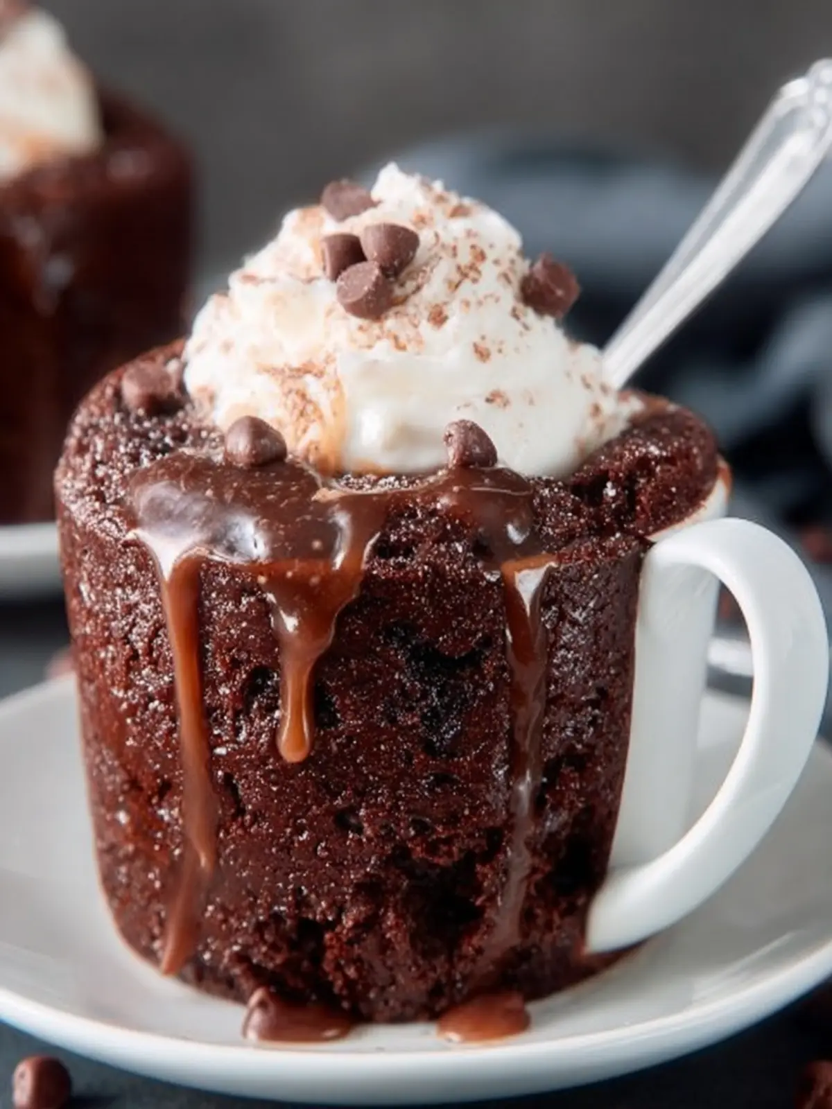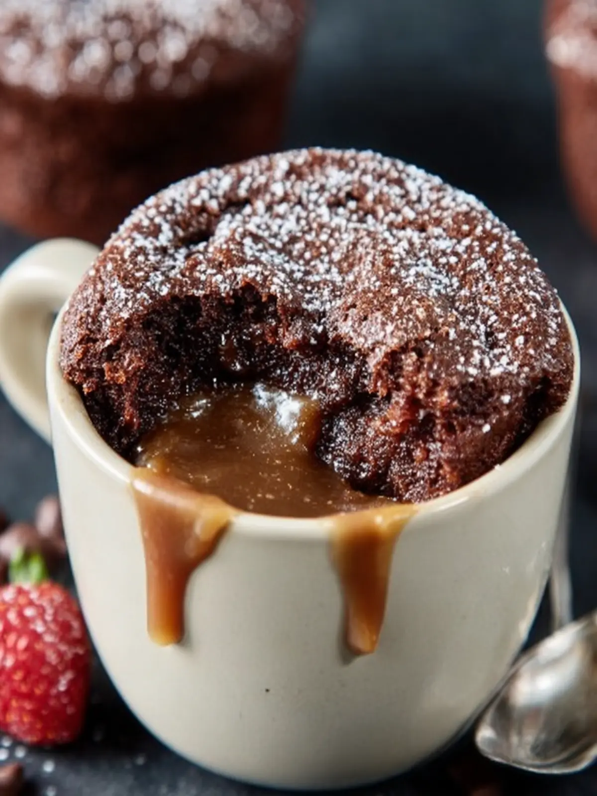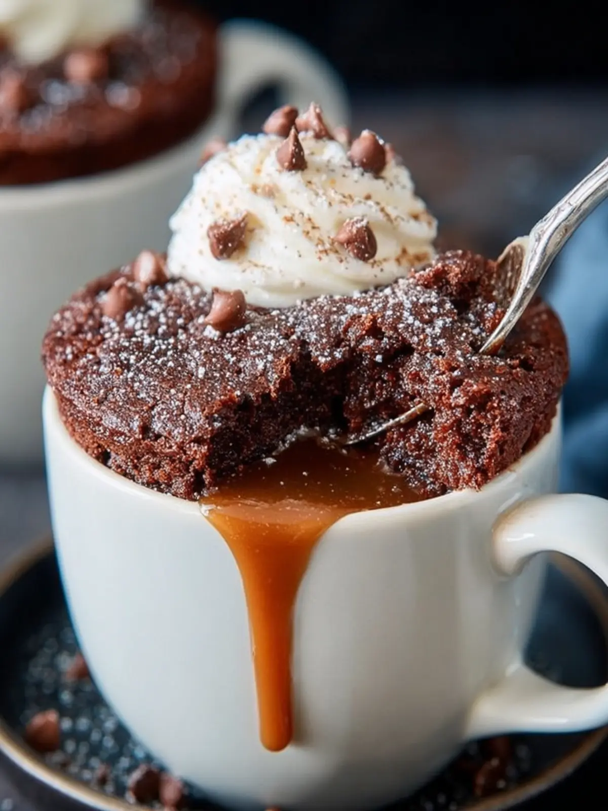 The combination of rich chocolate and sweet caramel creates a delicious harmony that dances on your taste buds. Thanks to the mug format, every spoonful is a blend of fluffy cake and gooey caramel sauce. It’s like a dessert hug that warms you from the inside out.