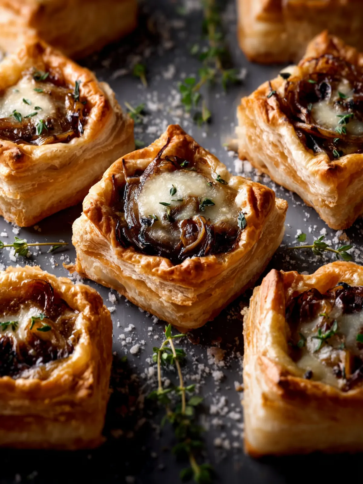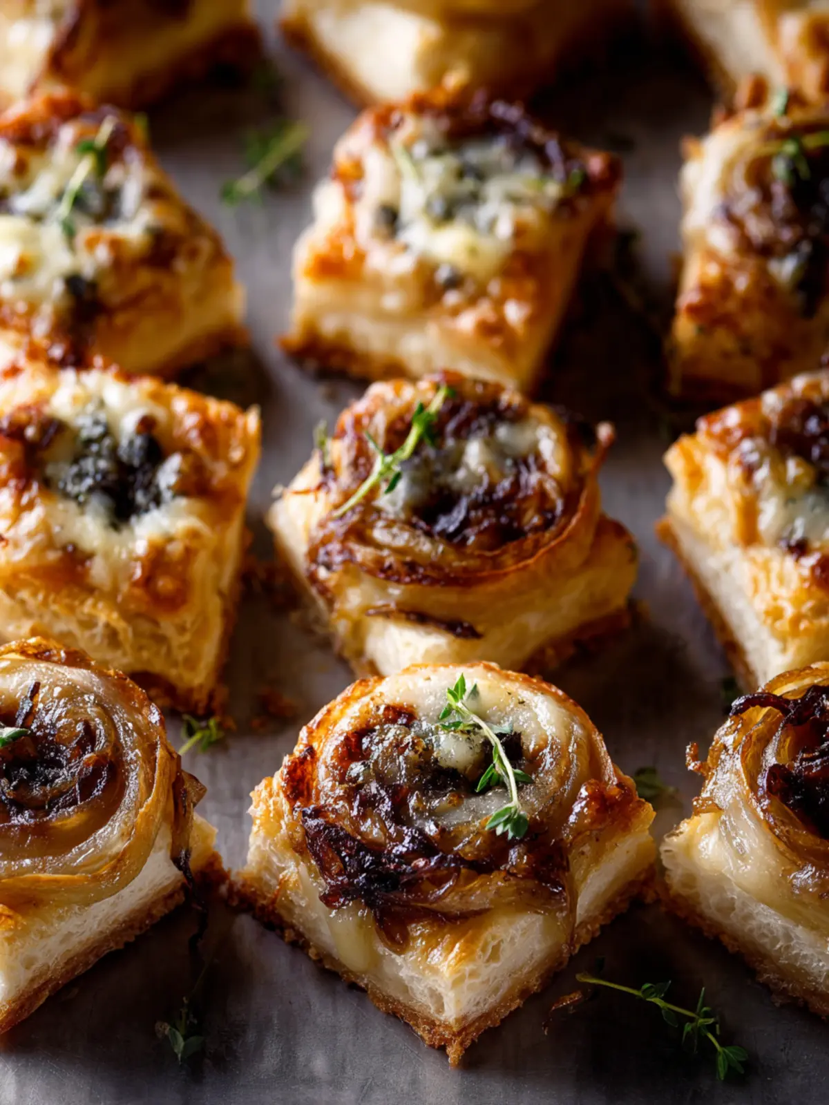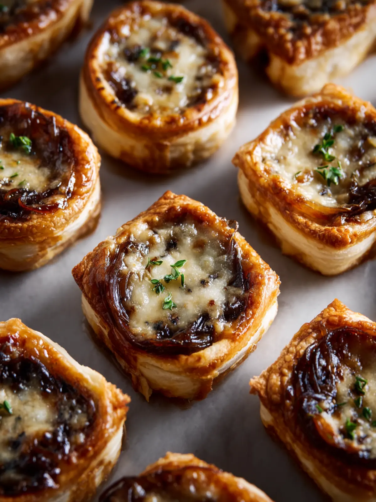 Delicious puff pastry bites filled with caramelized onions and Gruyere cheese, perfect as appetizers or snacks.