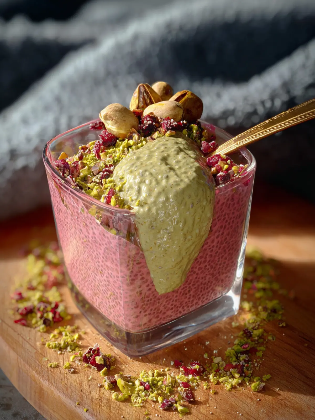 Packed with health benefits, chia seeds are known for their rich fiber content and high levels of Omega-3 fatty acids. The incorporation of pistachios adds an irresistible crunch and a burst of flavor, transforming a simple pudding into something truly gourmet.