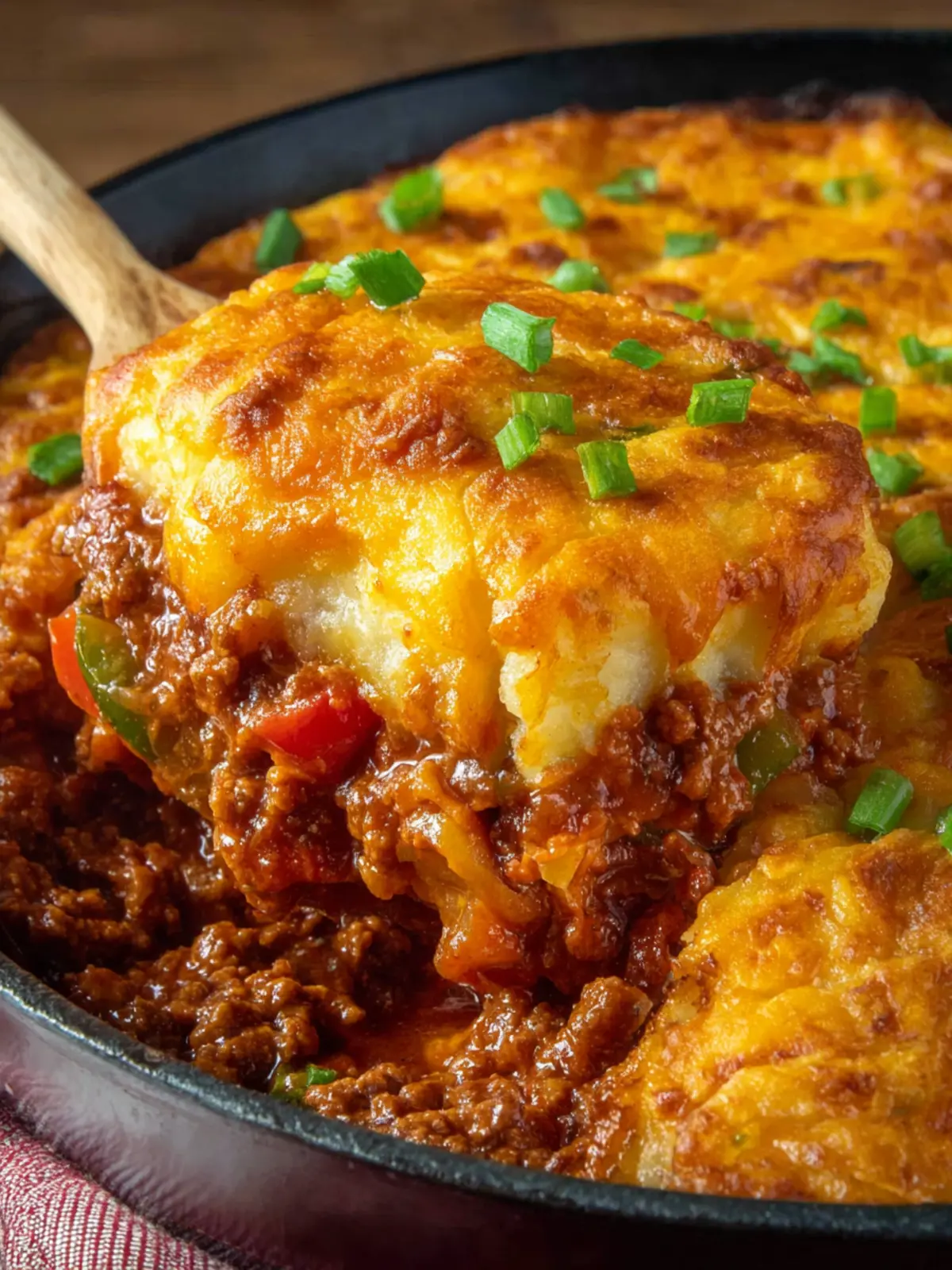 - You can pour the meat mixture into a 9×13 baking dish if you don’t have an oven safe skillet. Dollop the biscuit evenly over the top spreading it out as best you can.
