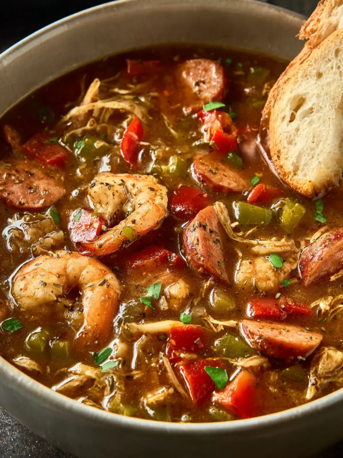 A flavorful chicken and shrimp gumbo made with andouille sausage, fresh vegetables, and a rich roux.