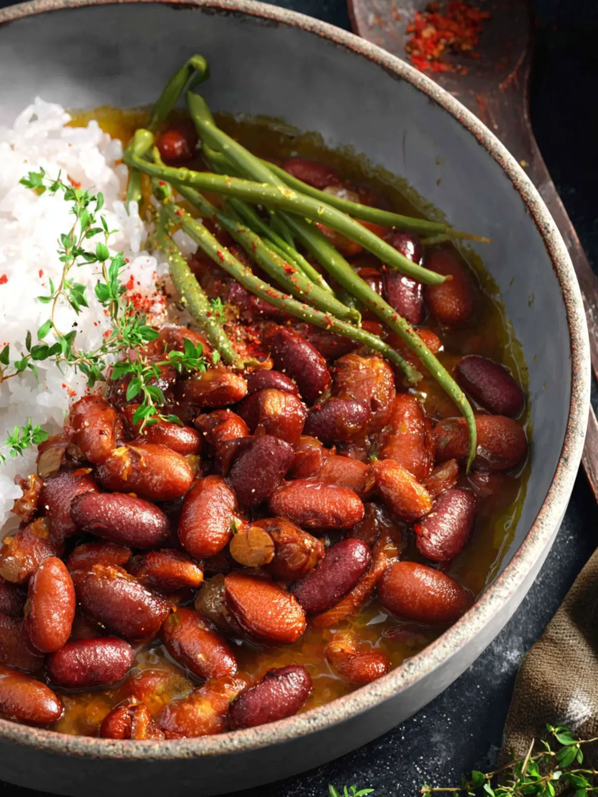 Pair your stewed red beans with steamed white rice for a cozy, classic combination. The beans’ rich, spicy flavors complement the subtlety of the rice, turning a simple meal into something special.