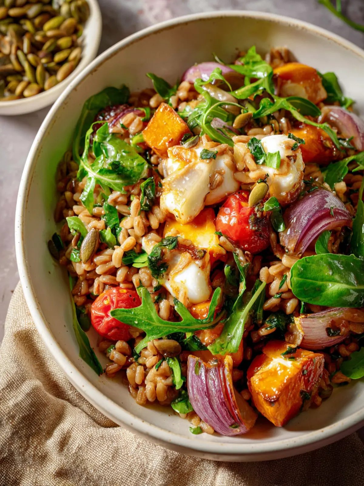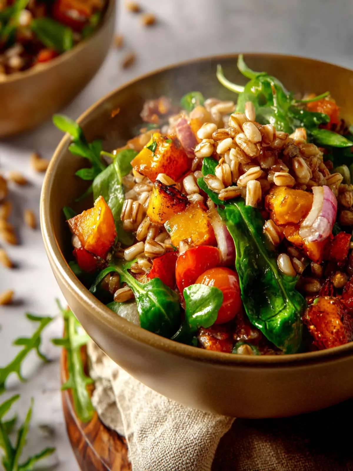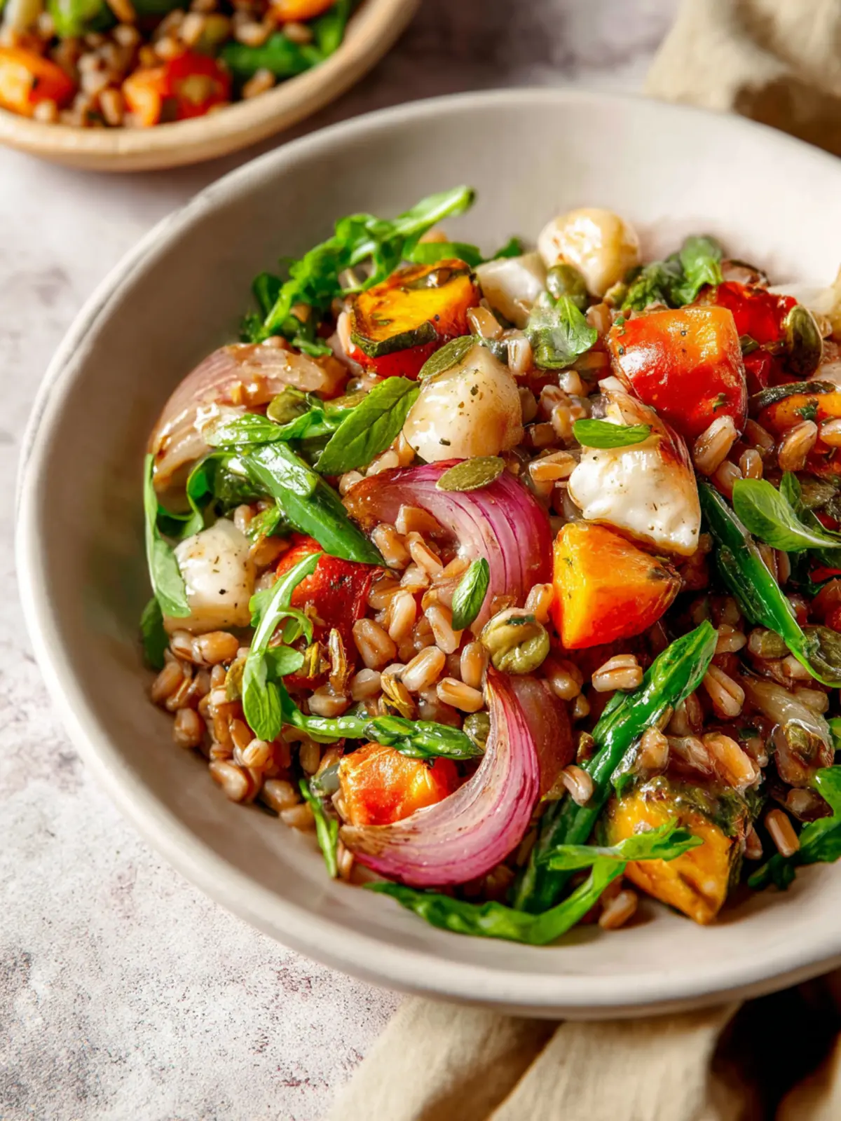 A hearty salad featuring roasted vegetables and farro, dressed with a tangy vinaigrette.